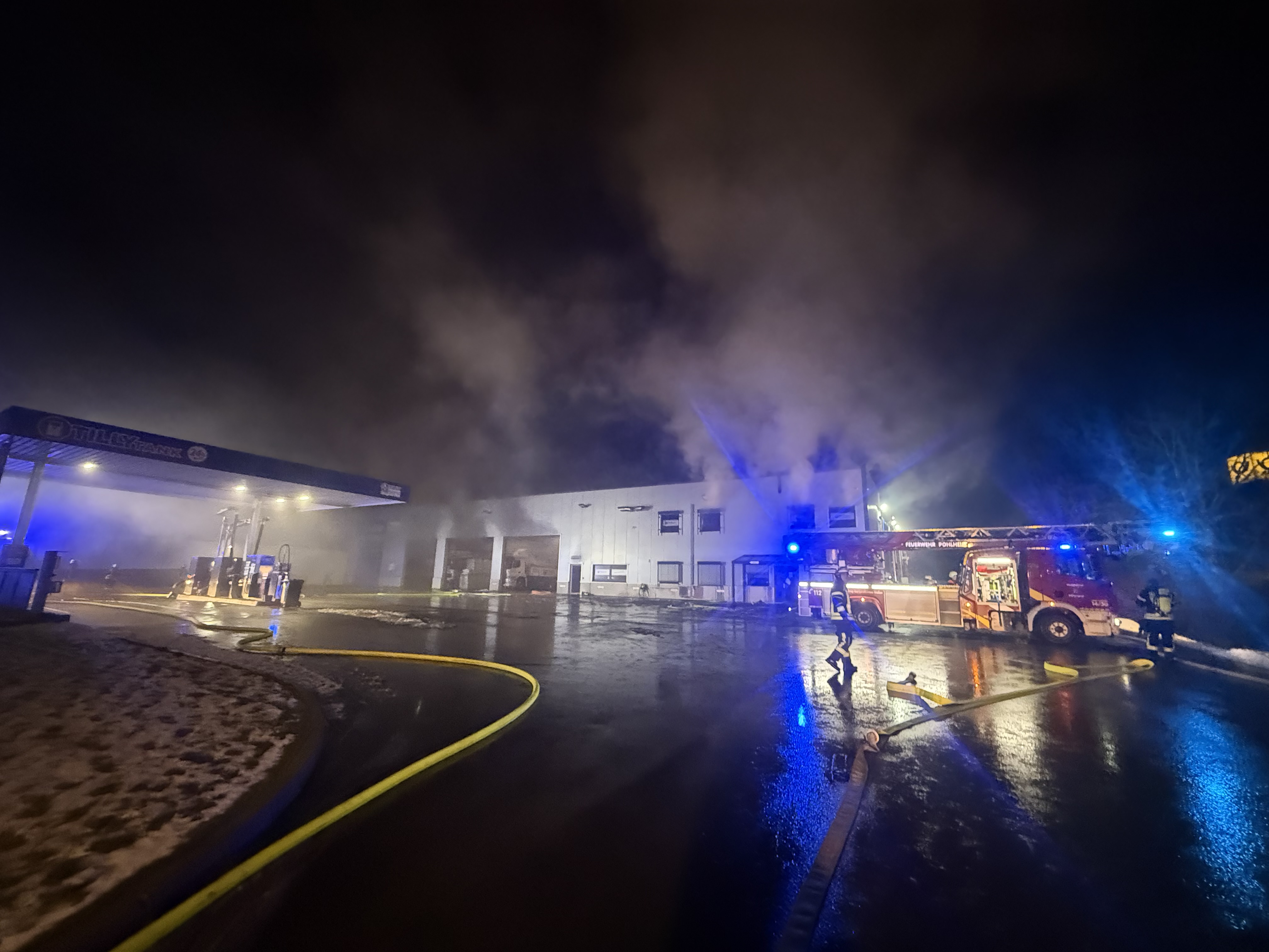 In den frühen Morgenstunden des 10.01.2026 wurde der Notruf verständigt, dass aus einem Gebäude Rauch dringt. Die alarmierten Einsatzkräfte der Feuerwehr Langgöns machten sich aus dem Ortsteil Lang-Göns auf den Weg in das Gewerbegebiet Perchstetten. Durch die ersten Einheiten wurde eine starke Rauchentwicklung in einem Industriegebäude festgestellt. Aus diesem Grund wurde für die Feuerwehr Langgöns Vollalarm ausgelöst. Kräfte aus allen Ortsteilen waren im Einsatz. Der Brandherd wurde durch die vorgehenden Trupps im ersten Obergeschoss des Verwaltungstraktes vorgefunden. Durch eine zügige Brandbekämpfung konnte das Feuer rasch unter Kontrolle gebracht werden. Die Nachlöscharbeiten gestalteten sich sehr Umfangreich. In einem großen Bereich mussten Zwischendecken und Wände geöffnet werden. Für die Verpflegung und mit technischem Gerät wurde das Deutsche Rote Kreuz hinzugezogen. Diese unterstützen mit einem Bagger beim entfernen des Brandschuttes aus dem ersten Obergeschoss. Aus der Gemeinde Reiskirchen und Stadt Lich wurden weitere Atemschutzgeräteträgern angefordert. Mit Unterstützung der Drehleiter aus Pohlheim wurde die Dachhaut geöffnet, da dort bereits Teile des Daches in Mitleidenschaft gezogen wurden. In Spitzenzeiten waren bis zu 120 Einsatzkräfte im Einsatz. Vielen Dank an das Deutsche Rote Kreuz, die Feuerwehren aus Linden, Pohlheim, Reiskirchen und Lich für die geleistete Unterstützung.