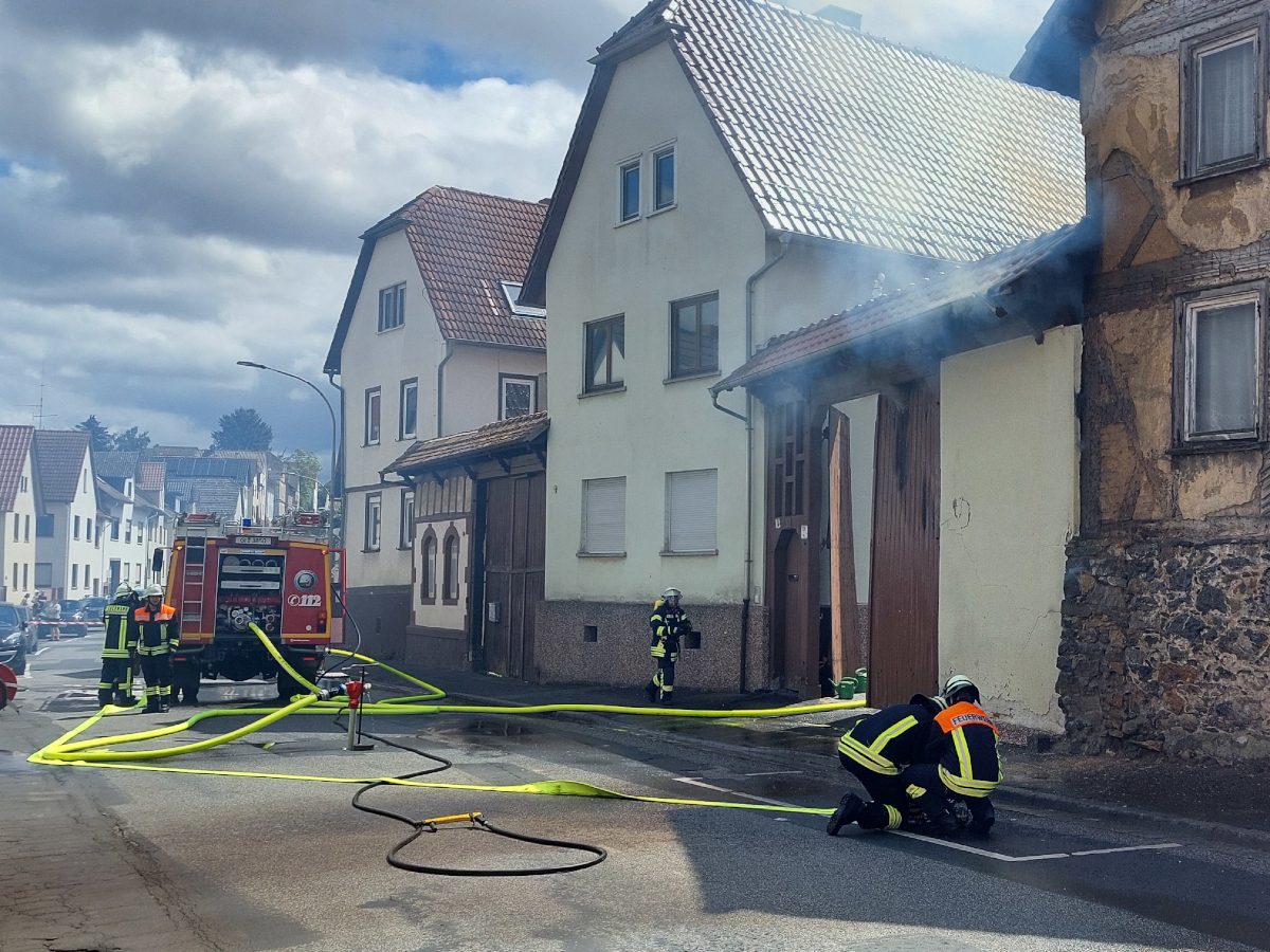 Am Mittag des 13.07.2024 kam es in Lang-Göns zu einem Gebäudebrand. Eine größere Menge Anrufer wählten den Notruf 112 und berichteten von einem Feuer im Ortskern. Die Feuerwehr Langgöns rückte mit dem Ortsteil Lang-Göns aus. Die ersten Kräfte fanden einen Vollbrand eines Holzschuppens vor. Die Flammen schlugen bereits durch das Hoftor. Das Feuer griff auf ein angrenzendes Gebäude über. Umgehend wurden weitere Kräfte aus den Ortsteilen Dornholzhausen und Niederkleen, sowieso der Feuerwehr Linden und der Berufsfeuerwehr Gießen nachalarmiert. Eine größere Ausbreitung konnte durch die Einsatzkräfte verhindert werden. Das Feuer wurde im Außenbereich und mit Kräften im Inneren des Gebäudes bekämpft. Der Holzschuppen brannte komplett nieder. Am angrenzenden Gebäude mussten Teile der Dachhaut geöffnet werden. Es wurden Glutnester im Dachbereich abgelöscht. Die Polizei hat die Brandursachenermittlung aufgenommen. Verletzt wurde niemand. Die Brandstelle wurde im Anschluss mehrfach kontrolliert. Es waren die Feuerwehr Langgöns mit 10 Fahrzeugen und 29 Einsatzkräften, der Einsatzleitwagen der Feuerwehr Linden, der Abrollbehälter Atemschutz der Berufsfeuerwehr Gießen, die Drehleiter der Feuerwehr Pohlheim, der Brandschutzaufsichtsdienst des Landkreises Gießen, ein Rettungswagen der Johanniter-Unfall-Hilfe e.V. und die Polizei vor Ort.