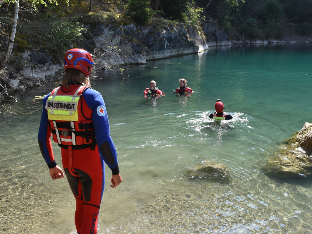 Bei strahlendem Sonnenschein trafen sich die Feuerwehr Langgöns und die DRK Wasserwacht Gießen zu einer gemeinsamen Übung am Steinbruchsee in Oberkleen.