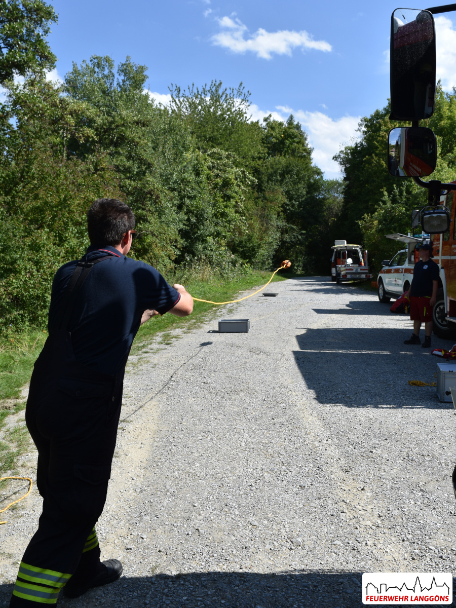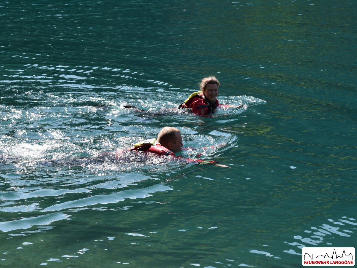 Bei strahlendem Sonnenschein trafen sich die Feuerwehr Langgöns und die DRK Wasserwacht Gießen zu einer gemeinsamen Übung am Steinbruchsee in Oberkleen.